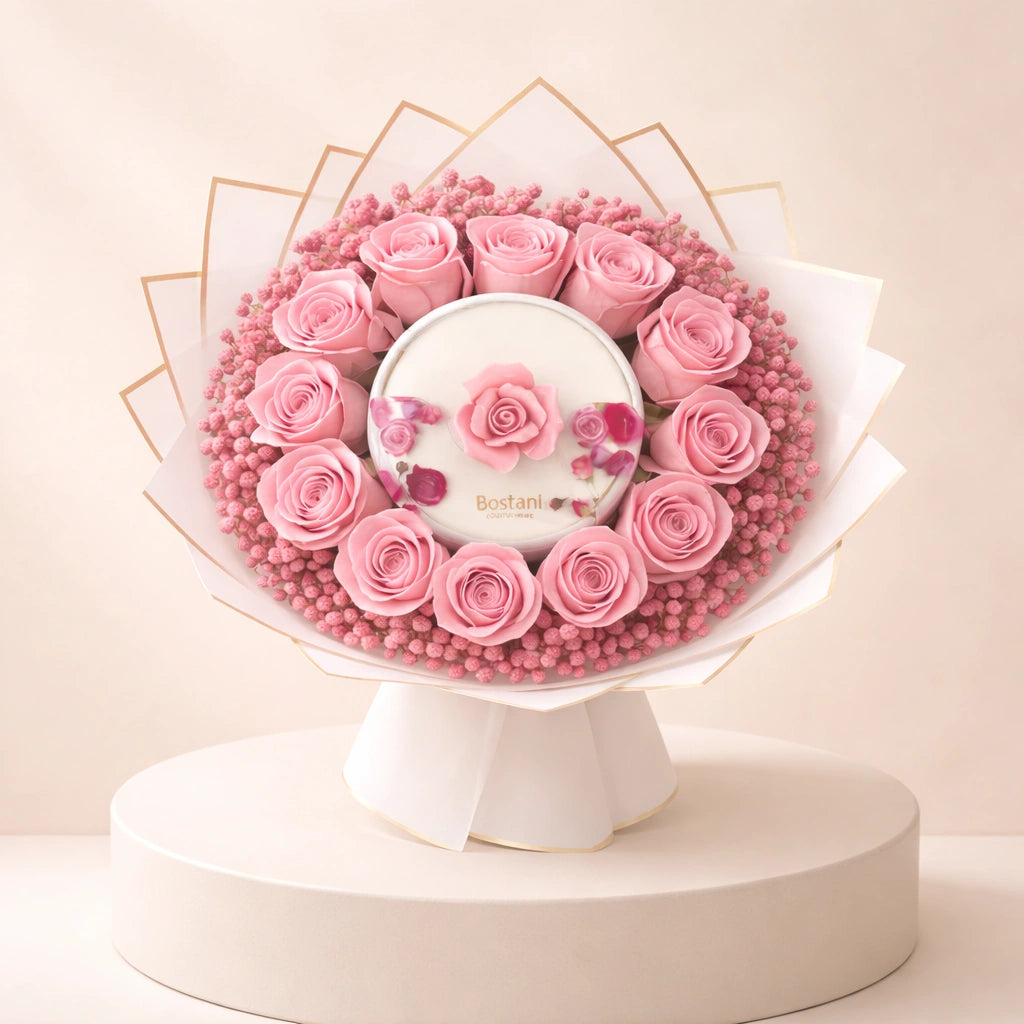 باقة شوكولاتة بوستاني بلون الورد هي هدية فاخرة تجمع بين أناقة الورود الطبيعية ومتعة شوكولاتة بوستاني الفاخرة. تتألق باقة دائرية رائعة من الورود الوردية الناعمة، تحيط بقطعة مركزية من شوكولاتة بوستاني المصنوعة يدويًا والمزينة بتفاصيل زهرية دقيقة.