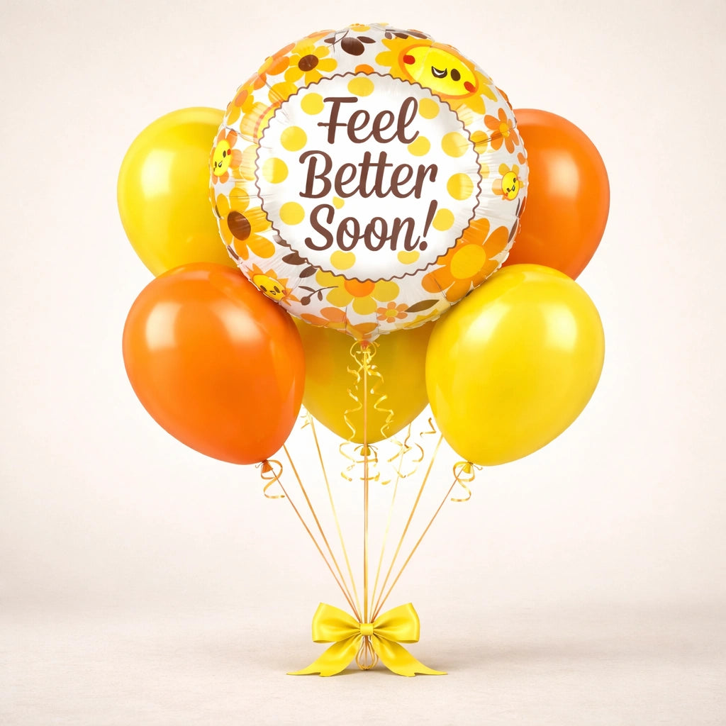 أضف البهجة إلى يوم أحدهم مع باقة بالونات "نتمنى لك الشفاء العاجل" المبهجة. تتضمن هذه الباقة بالونًا زهريًا لامعًا من رقائق معدنية، بالإضافة إلى بالونات لاتكس صفراء وبرتقالية متناسقة. تُعد هذه المجموعة الرائعة مثالية لزيارات المستشفيات، ومفاجآت التعافي في المنزل، وهدايا التهنئة بالشفاء. طريقة دافئة ومبهجة لإرسال الحب وتمنيات الشفاء العاجل. 🌼💛
