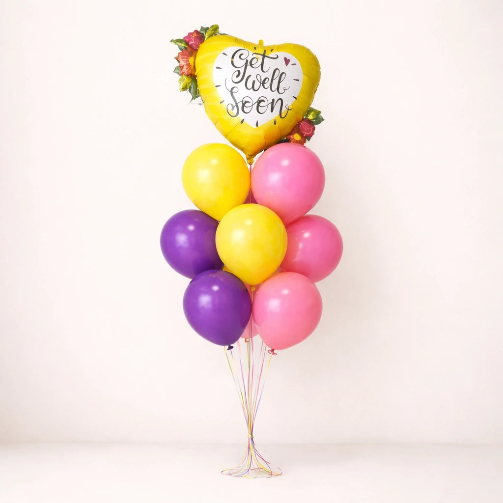 باقة بالونات مبهجة تضم بالونًا كبيرًا على شكل قلب مكتوب عليه "أتمنى لك الشفاء العاجل" مقترنًا ببالونات لاتكس نابضة بالحياة باللون الوردي والأصفر والأرجواني - مثالية لإرسال أطيب التمنيات والإيجابية ومفاجأة الشفاء السريع.