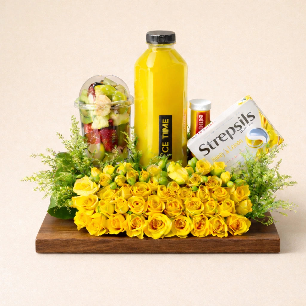 مجموعة هدايا فاخرة مستوحاة من مفهوم العافية، مصممة للتعبير عن الاهتمام والراحة بأرقى صورة. تتضمن مجموعة هدايا "جولدن كير" الفاخرة زجاجة عصير برتقال طازج، وعلبة من أقراص ستربسلز بالعسل والليمون، وأقراص فيتامينات فوارة، وكوب فواكه طازجة مليء بالفراولة والكيوي والأناناس والموز.