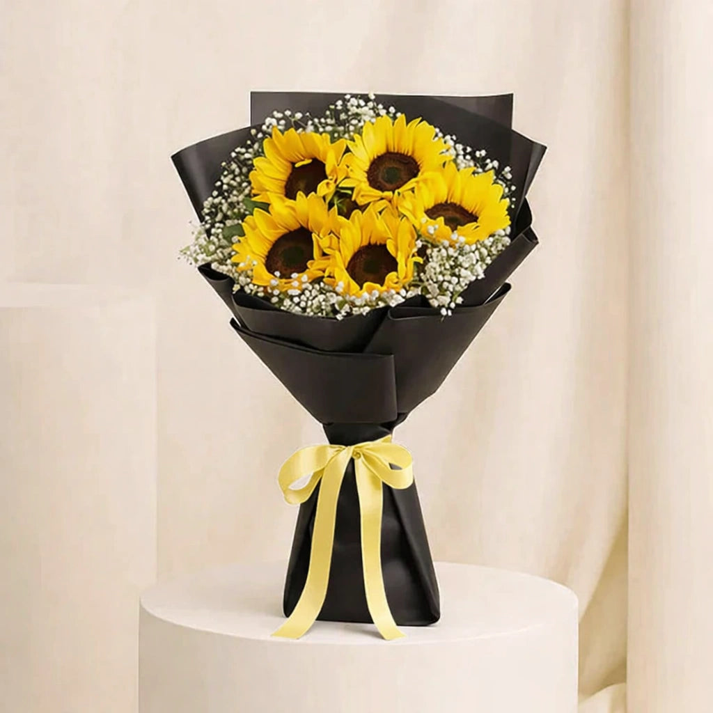 باقة نابضة بالحياة من زهور عباد الشمس الصفراء النضرة، ملفوفة بورق أسود أنيق ومربوطة بشريط أحمر داكن. تتألق هذه الباقة الأنيقة على خلفية بيج بسيطة مع إضاءة استوديو ناعمة، لتخلق مظهرًا جريئًا وراقيًا في آنٍ واحد، مثاليًا لتقديمه كهدية أو لتزيين المنزل. ✨