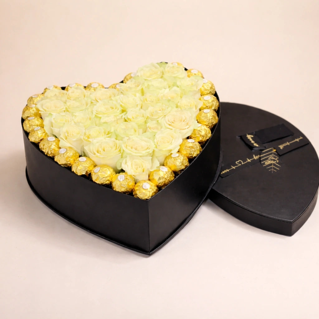 علبة سوداء فاخرة على شكل قلب مليئة بورود عاجية طازجة، محاطة بشكل جميل بشوكولاتة فيريرو روشيه الفاخرة، مما يخلق هدية راقية ورومانسية مثالية للاحتفالات التي لا تُنسى.