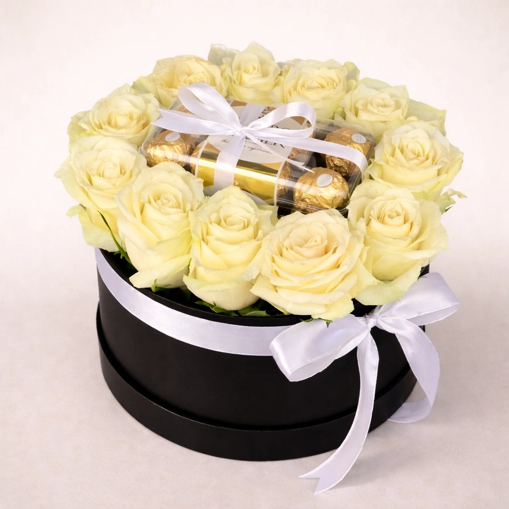 صندوق زهور أنيق يضم ورودًا بيضاء نضرة مُرتبة بشكل جميل حول علبة شوكولاتة فيريرو روشيه ، مُقدم في علبة هدايا دائرية أنيقة مع شريط من الساتان - مثالي لأعياد الميلاد، والذكرى السنوية، وعيد الأم، والاحتفالات الخاصة. 🌹🍫✨