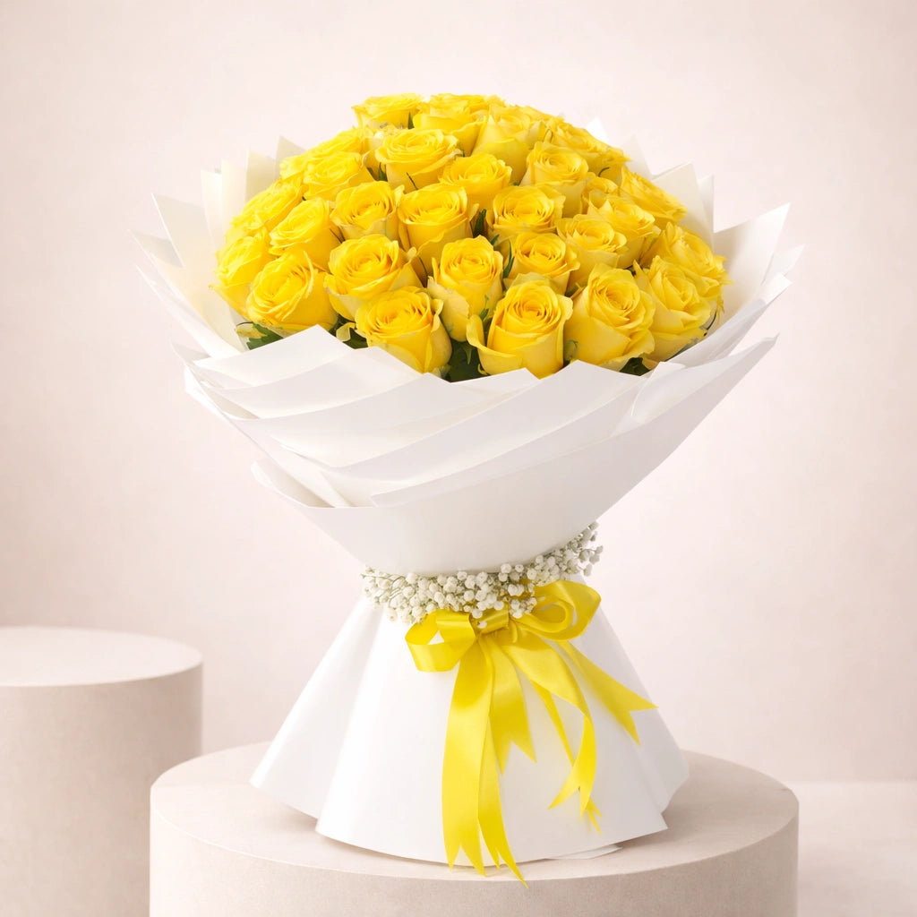 باقة أنيقة من الورود الصفراء الطازجة ملفوفة بورق أبيض فاخر ومزينة بشريط أصفر جميل - مثالية لأعياد الميلاد والتهاني والمناسبات الخاصة. 💛