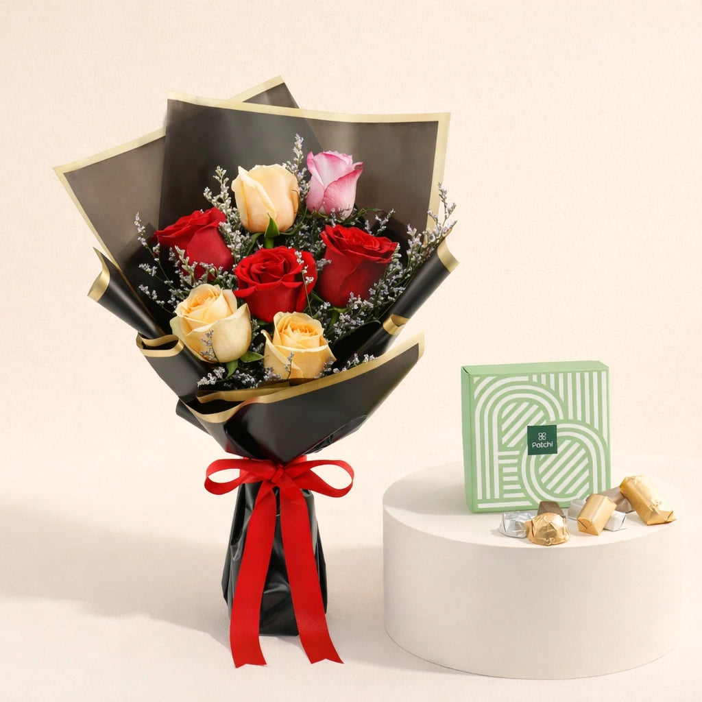 احتفلوا بلحظاتكم المميزة مع هذه الهدية الأنيقة التي تضم باقة رائعة من الورود الطازجة المتنوعة مع شوكولاتة باتشي الفاخرة. تتضمن الباقة ورودًا خلابة باللون الأحمر والكريمي والوردي، مُنسقة بعناية مع أزهار صغيرة رقيقة، ومغلفة بورق تغليف أنيق باللونين الأسود والذهبي، ومزينة بشريط أحمر نابض بالحياة.