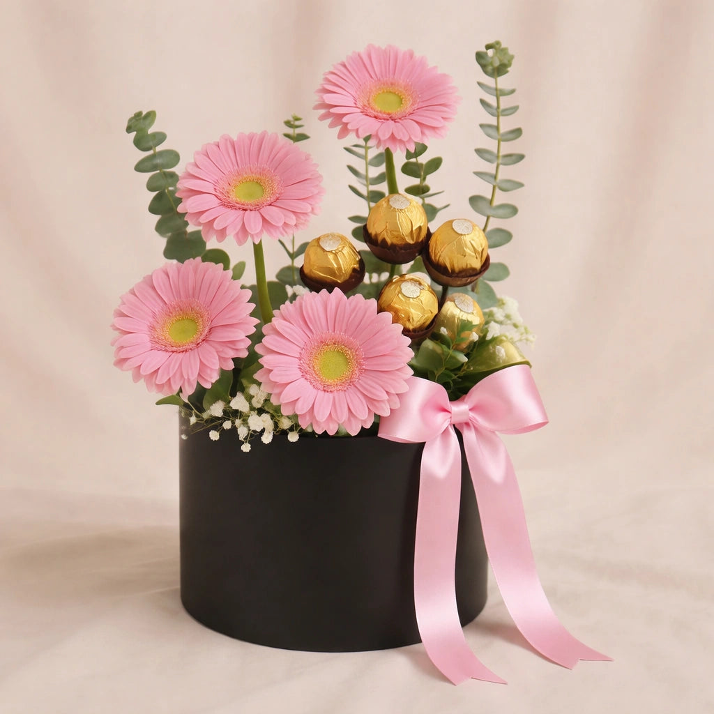 باقة ساحرة من زهور الجربيرا الوردية النضرة، مُقدمة مع شوكولاتة فيريرو روشيه الفاخرة، في علبة سوداء أنيقة مزينة بشريط وردي فاتح ناعم. هدية مثالية لأعياد الميلاد، والاحتفالات، أو المفاجآت اللذيذة.