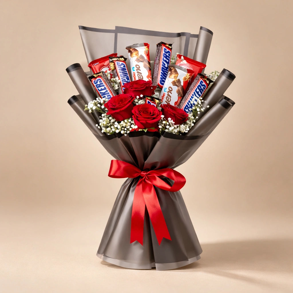 تتميز هذه الباقة المذهلة بورود حمراء نابضة بالحياة محاطة بمجموعة متنوعة من الشوكولاتة المفضلة، ملفوفة بورق أنيق غير لامع ومزينة بشريط ساتان أحمر فاخر لإطلالة مميزة.